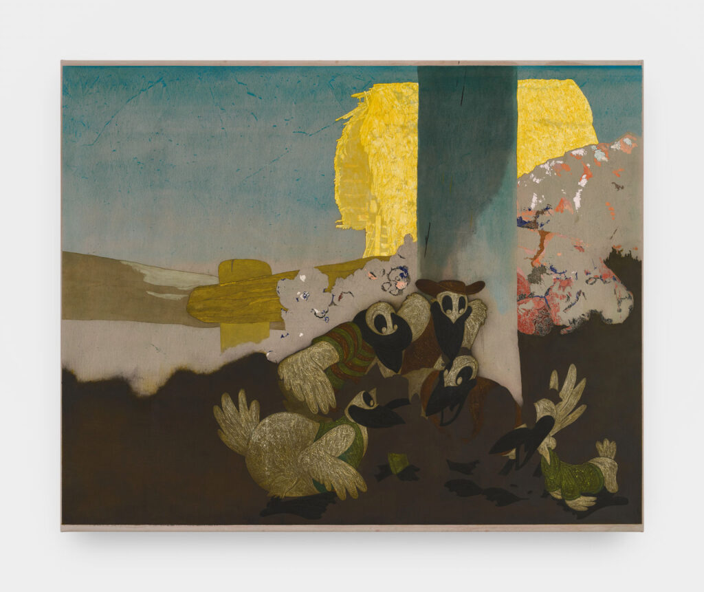 The tonality of the hues – which brighten a slick richness in the right-minded choice of yellow which ushers that muted melancholy, and the primary vivids in relation to the crowbird-idea, move onto mystery, if not mystique in the otherwise plainview of the plain presented to us by Dustin Hodges at Sebastian Gladstone.